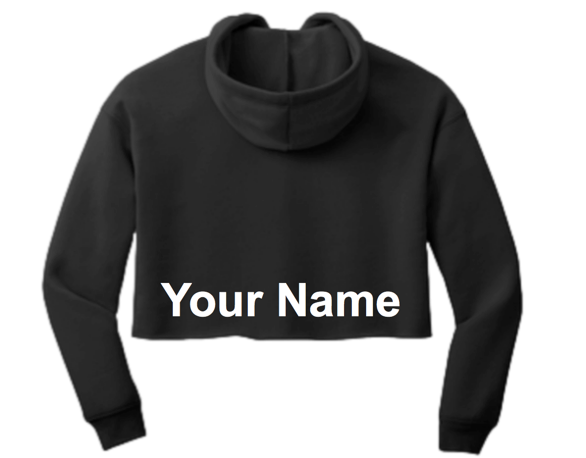 Black crop hoody with pink & white logo on front and name on the back as per the spec of AJDC
