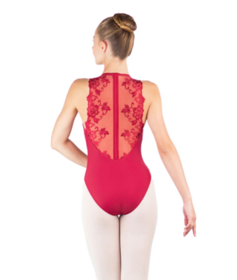 Stand out in the stunning Ester leotard from Ballet Rosa. This sleeveless women’s leotard has secure wide straps and a gathered neckline to the front, and features an elegant full back of delicate Austrian Lace and a secure zip fastening down the back. A flattering matte Lycra leotard which is fully lined at the front.