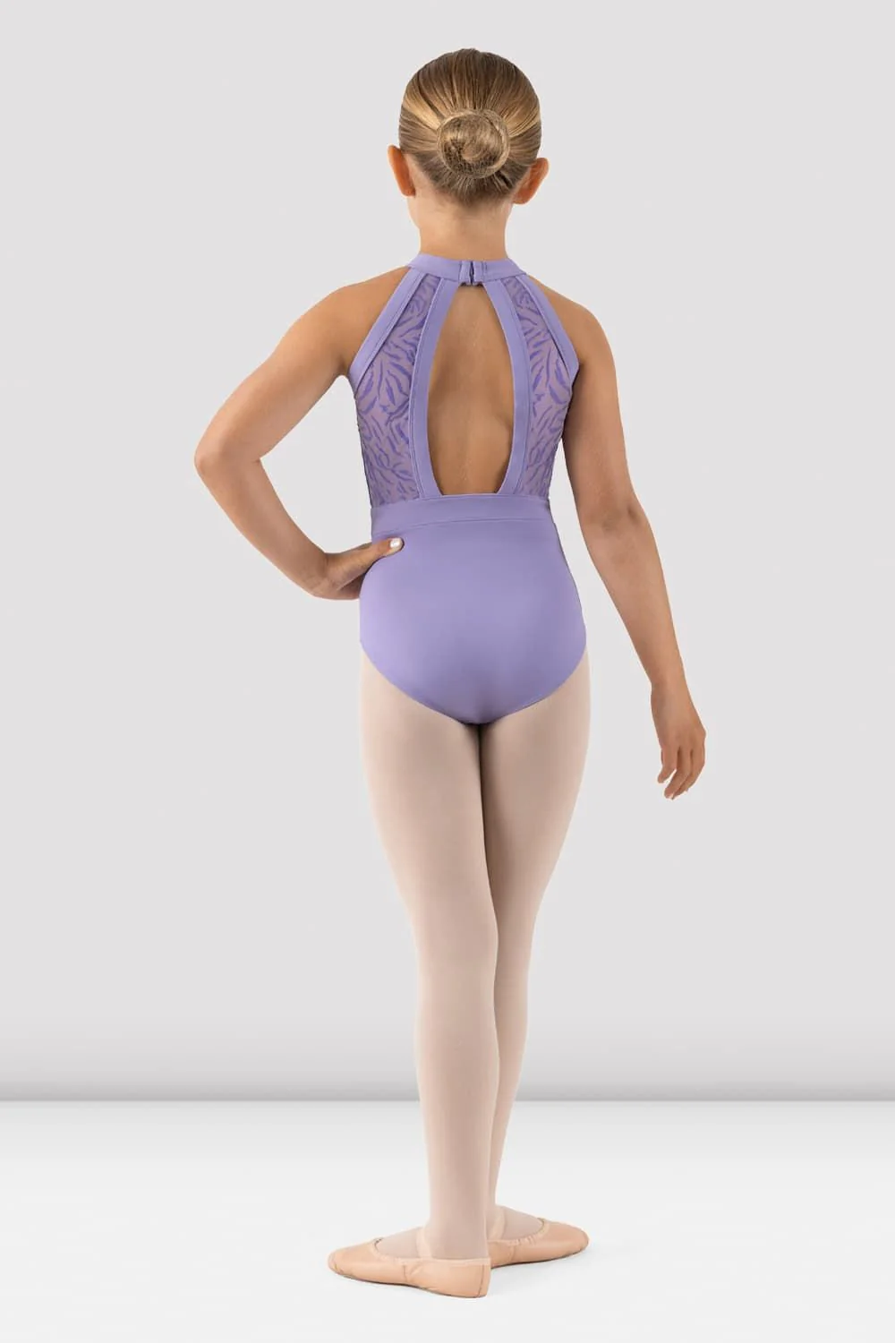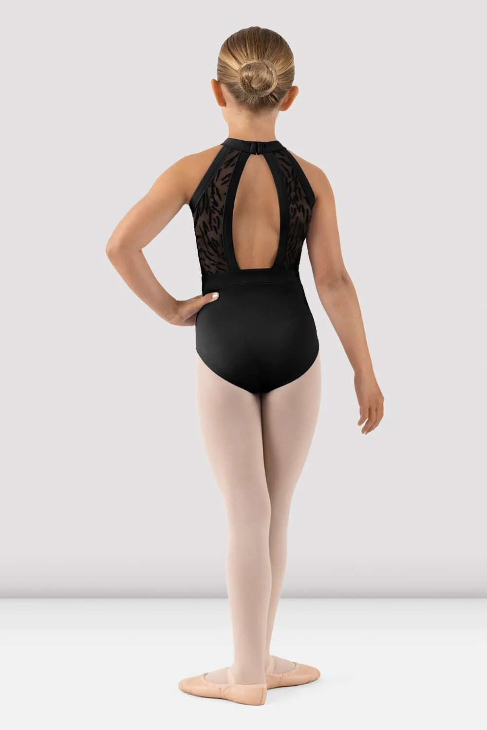 Our Girls Ellie Halterneck Leotard features a flocked mesh bodice with a halterneck neckline and open back. Part of our Girls Holiday Collection; a collection of adorable designs fashioned in soft flocked mesh, available in three class-ready tones. Each piece is comfortable as it is elegant.