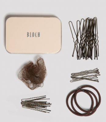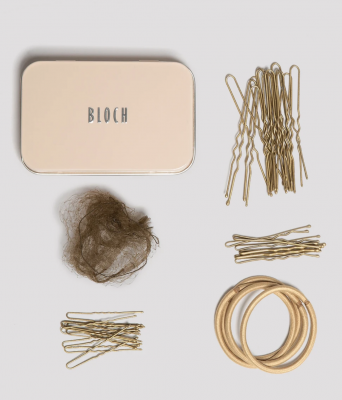 Hair Kit from Bloch in a lovely pink tin. A must-have accessory for dancers of all ages, this Bloch Hair Kit has everything you need to create and maintain the perfect bun. Alongside a how-to guide for the best bun, the kit contains a handy variety of hair accessories, including: two nets, fifteen 3″ pins, ten 2″ pins, six bobby pins, and four elastics.