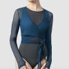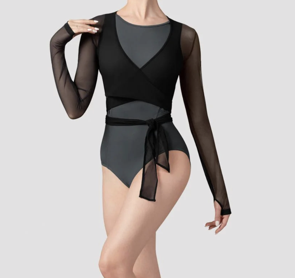 Our Ladies Bethan Mesh Wrap Top features full length sleeves, a timeless adjustable tie waist with a deep V neck. Pair with your favorite Bloch Entwine leotard for a studio ready look. Our Bloch Entwined Collection features a contemporary twist on classic silhouettes. Beautifully fashioned with intricate woven twist details and soft mesh accents for a touch of elegance. Crafted from our signature performance fabric that moves effortlessly with you and available in classic black and a striking peacock blue.
