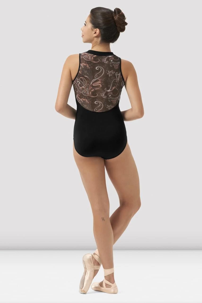 Our Ladies Mirella Boheme Zip Front Leotard features a high neck with zip front and a printed paisley mesh back. Part of our Mirella La Bohéme Collection featuring intricate paisley prints, rouleau details and contemporary back designs. This collection highlights a variety of standout silhouettes, available in a trio of muted hues.