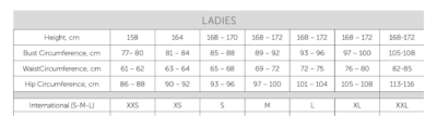 XS – 36, S – 38, M -40, L – 42, Xl – 44