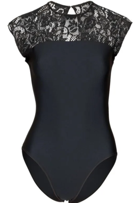 Cap sleeve leotard in Nylon Lycra with stretch lace yoke.