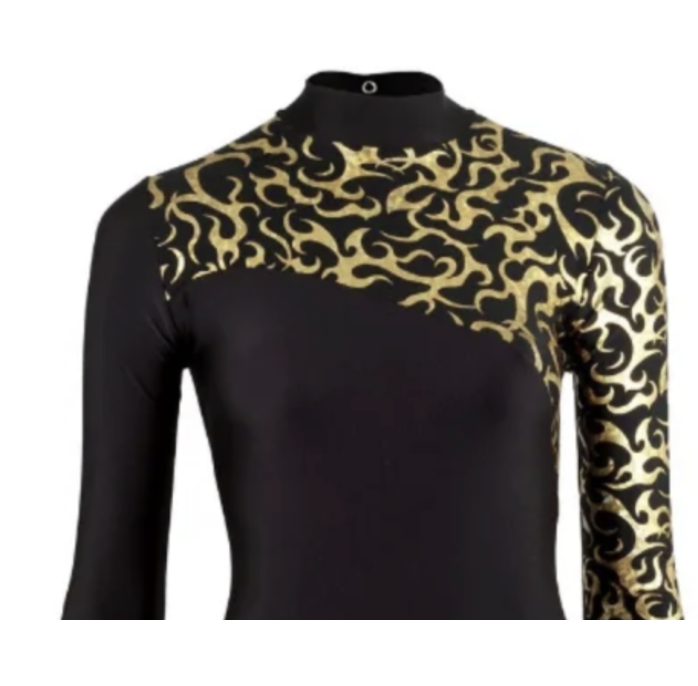 Long sleeve leotard with a polo neck and keyhole back in Nylon Lycra Printed Foil. Suitable for dance, ice skating, cheerleading and majorettes.